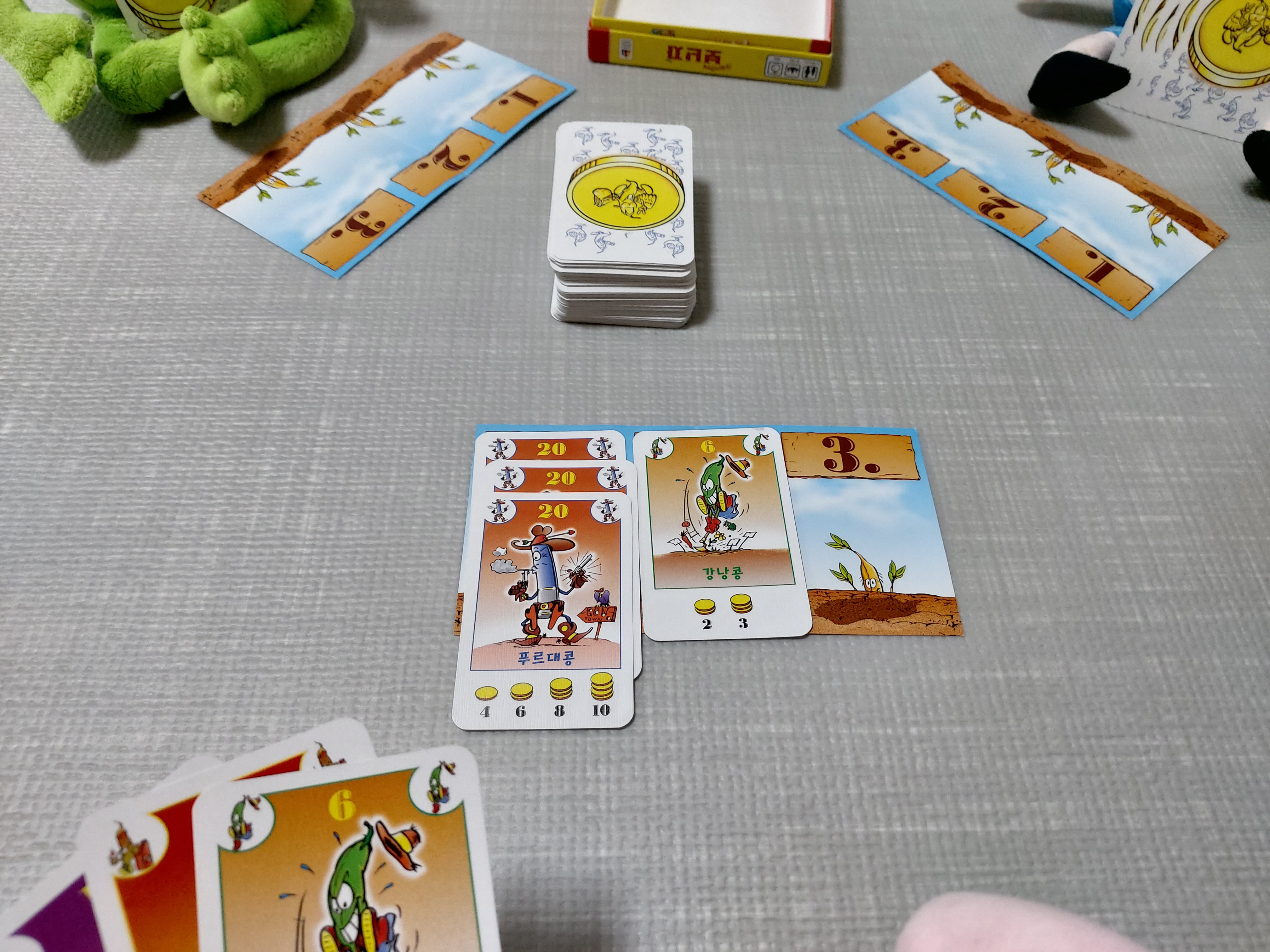 3. 콩심기 : 뒤집은 카드 2장과 거래했던 카드들을 모두 각자의 밭에 심습니다. 공개된 카드들은 반드시 심어야하고 손에 다시 들면 안됩니다.